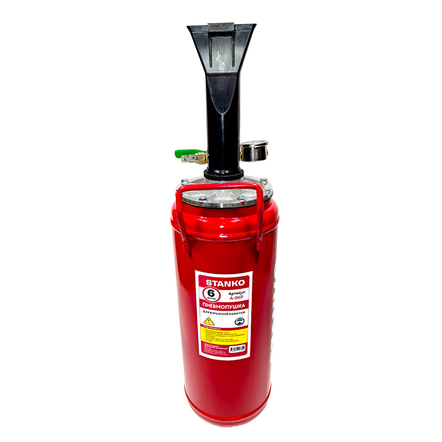 Взрывная пневмопушка «Станкоимпорт» А-06Р, 6 л. (бустер) — это компактное устройство с ресивером (баллоном), в который закачивают сжатый воздух при помощи компрессора.
