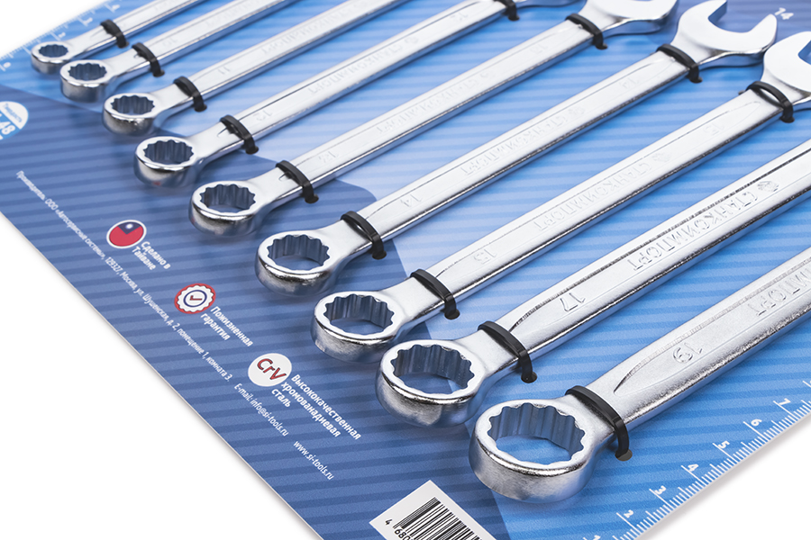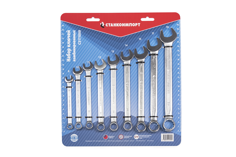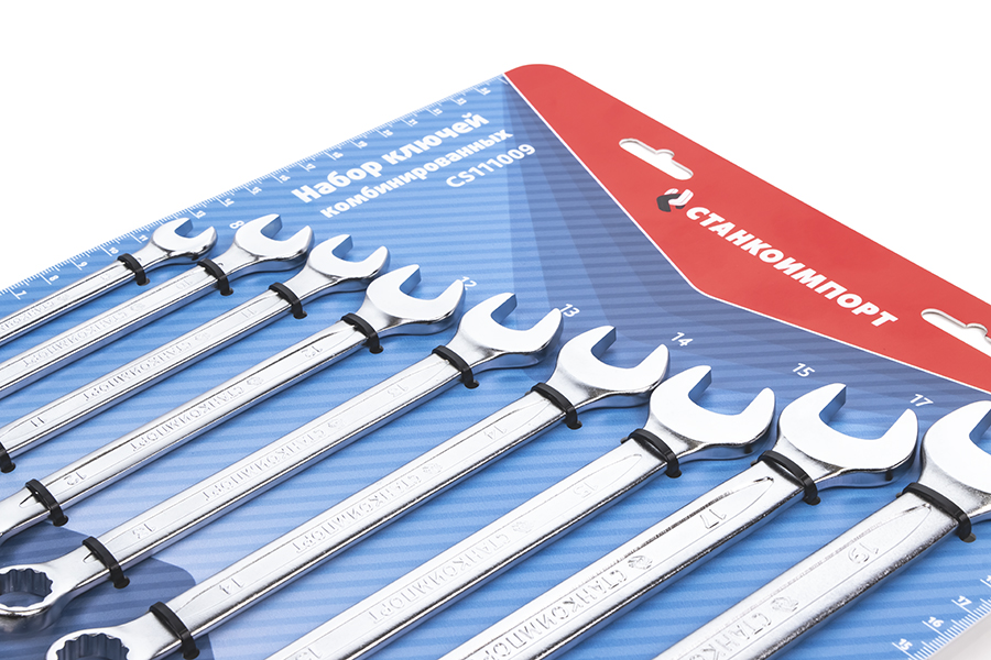 Набор комбинированных ключей Станкоимпорт содержит в себе 9 предметов, представляющих собой конструкцию, объединяющую рожковый и накидной профили. Данный набор состоит из следующих размеров: 8 мм, 10 мм, 11 мм, 12 мм, 13 мм, 14 мм, 15 мм, 17 мм, 19 мм. Поставляется на подложке из пластика, на которой ключи крепко зафиксированы с помощью хомутов. Подложка имеет линейку, что предоставляет возможность ее дальнейшего использования.