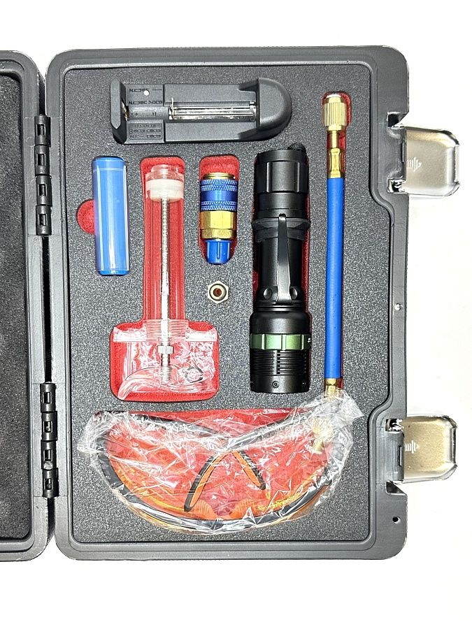 Набор применяется для поиска утечек хладагента в системе кондиционирования автомобилей, работающих на хладагенте R134A.