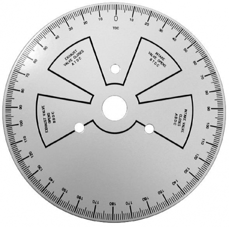 Станции технического обслуживания, автосервисы, автомастерские. Применяется для настройки и регулировки фаз механизма газораспределения (разметка положения клапанного механизма). Диск имеет разметку 360° и визуальные зоны состояния клапанов. Отверстие в центре - для точного крепления. Диск используется в сочетании со стрелочным индикатором. Внешний диаметр диска - 230 мм. Диаметр осевого отверстия - 25 мм. Диаметр отверстия для болтов крепления - 10 мм.